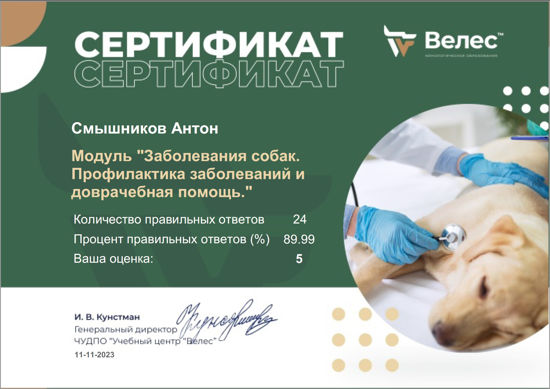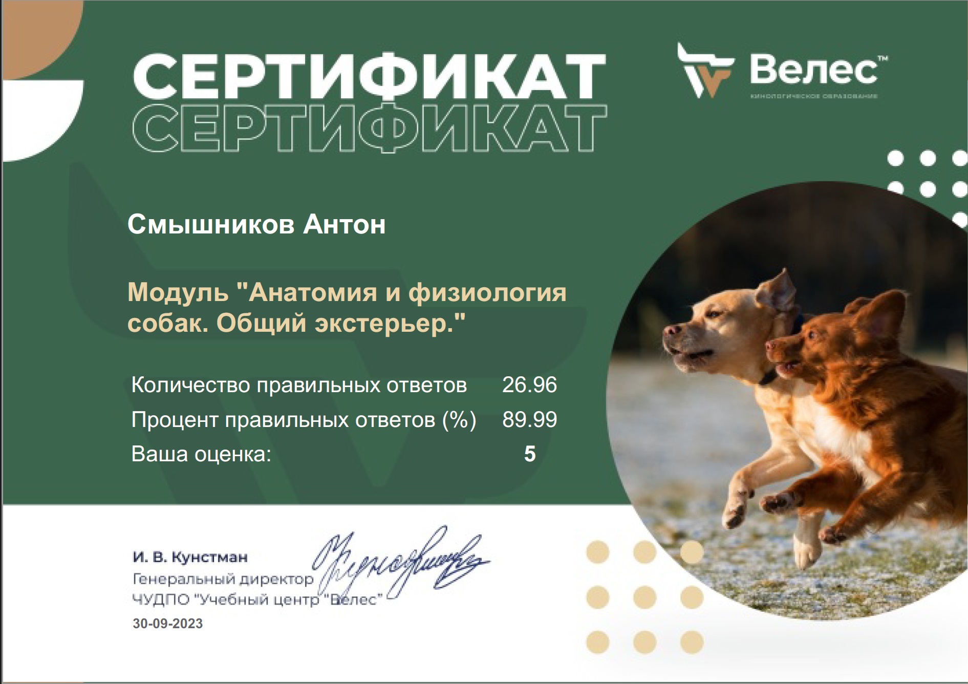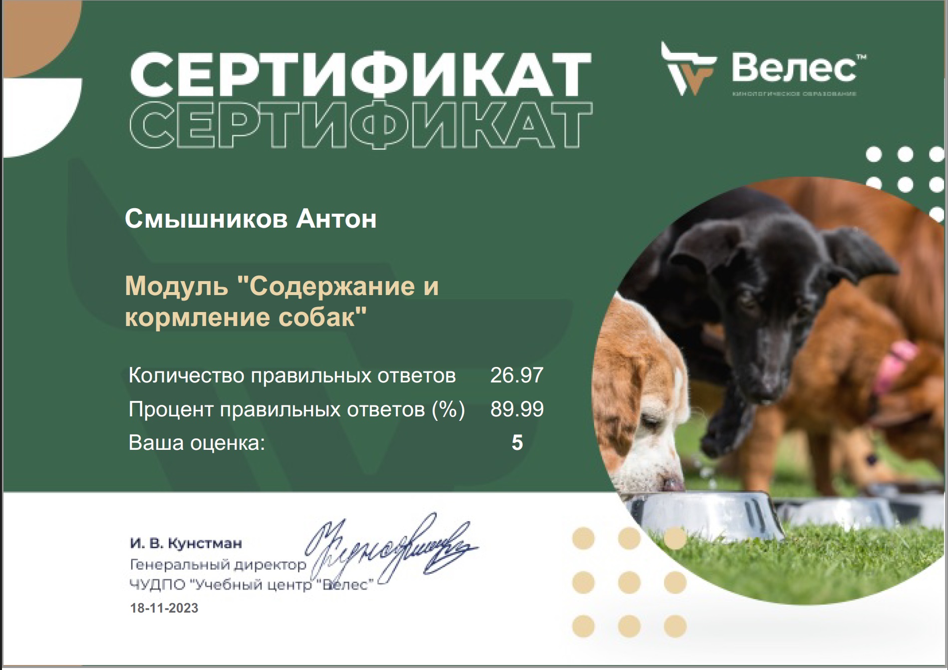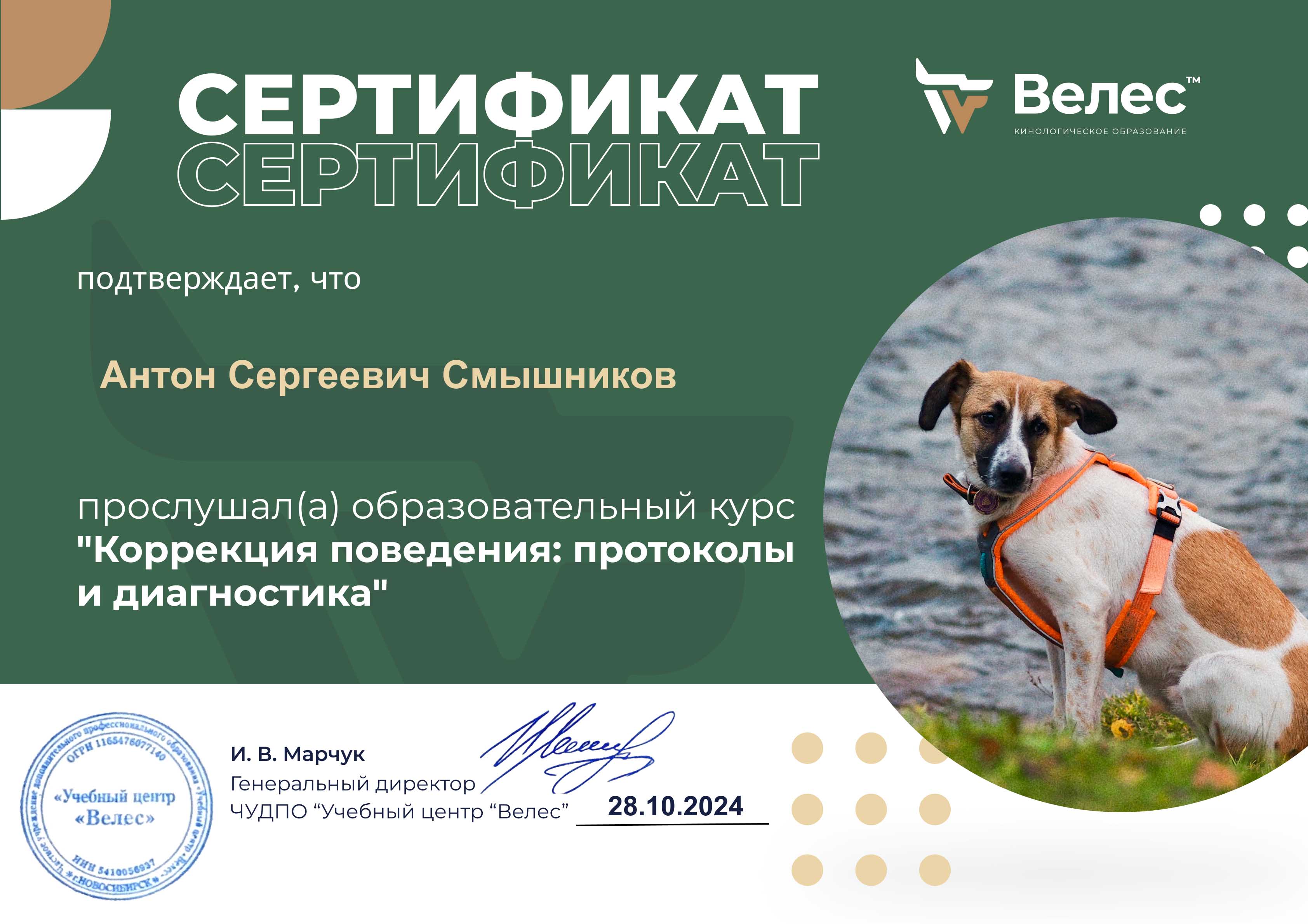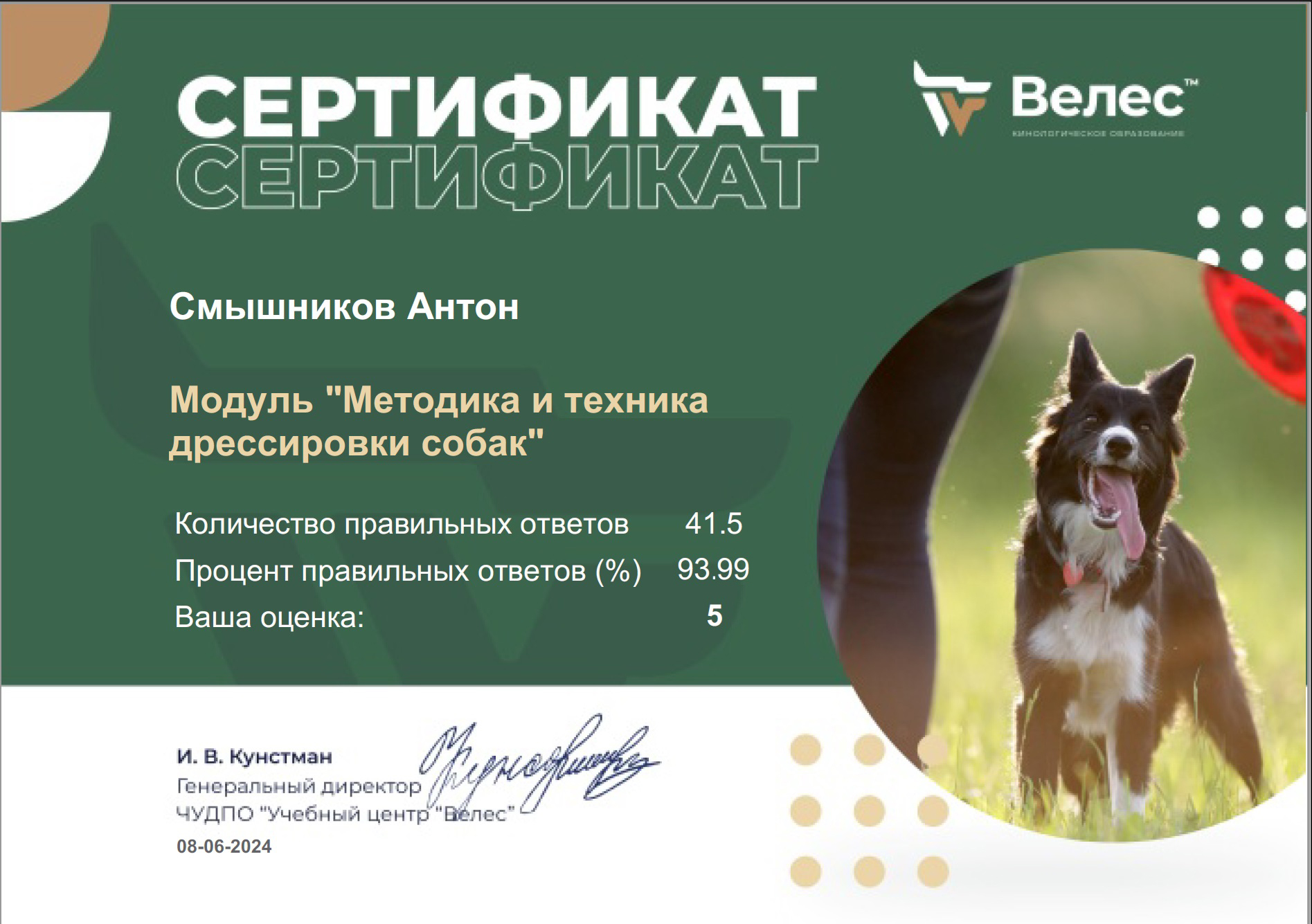 Сначала это было просто увлечением. Я погрузился в изучение поведения собак, читал книги, смотрел видео, пробовал разные методики на Беллатриссе. Вскоре стало ясно: без системного подхода не обойтись. Я поступил на курсы в учебный центр «Велес», где получил профессиональные знания по дрессировке и коррекции поведения.